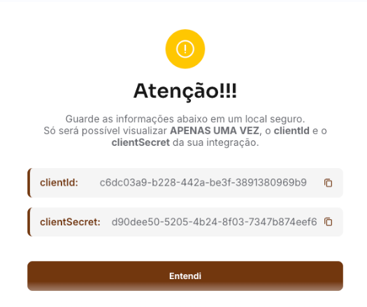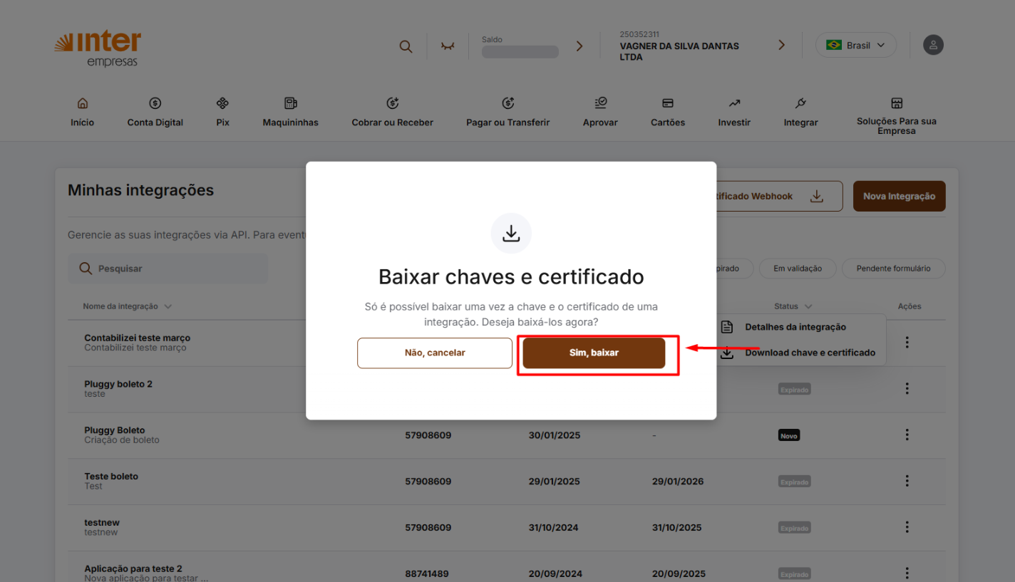 - ⚠️ A chave e o certificado só poderão ser baixados uma única vez.