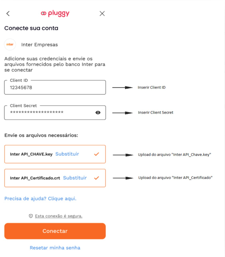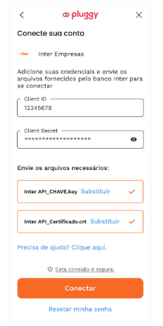 Essas quatro informações serão utilizadas para realizar a conexão da sua contra Inter Empresas com a Pluggy.