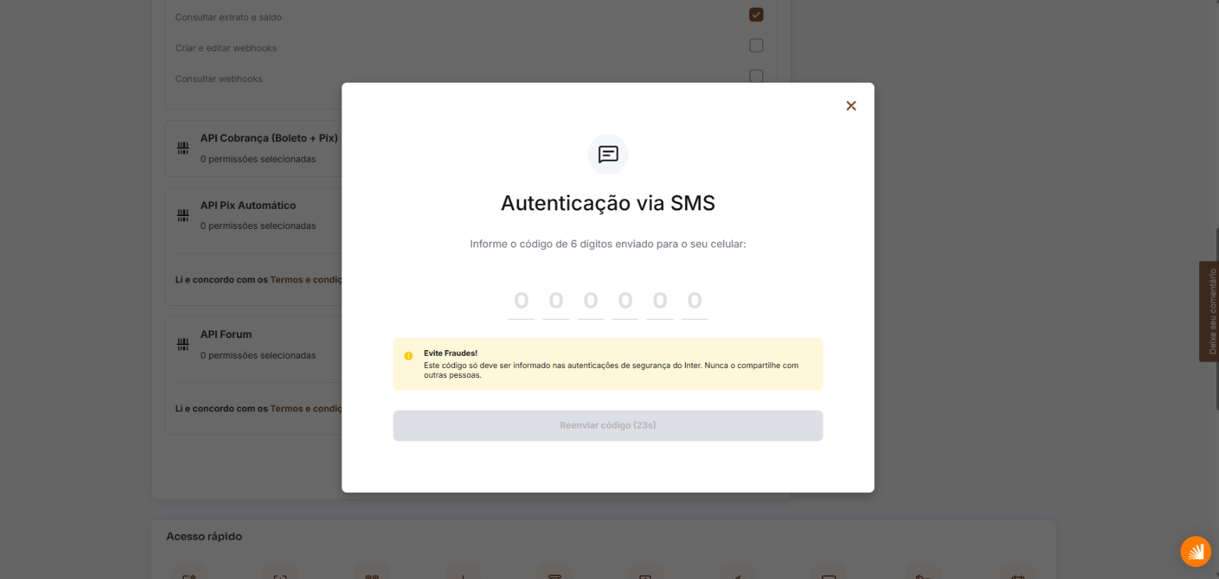 O Banco Inter enviará um código de 6 dígitos via SMS para o celular cadastrado.