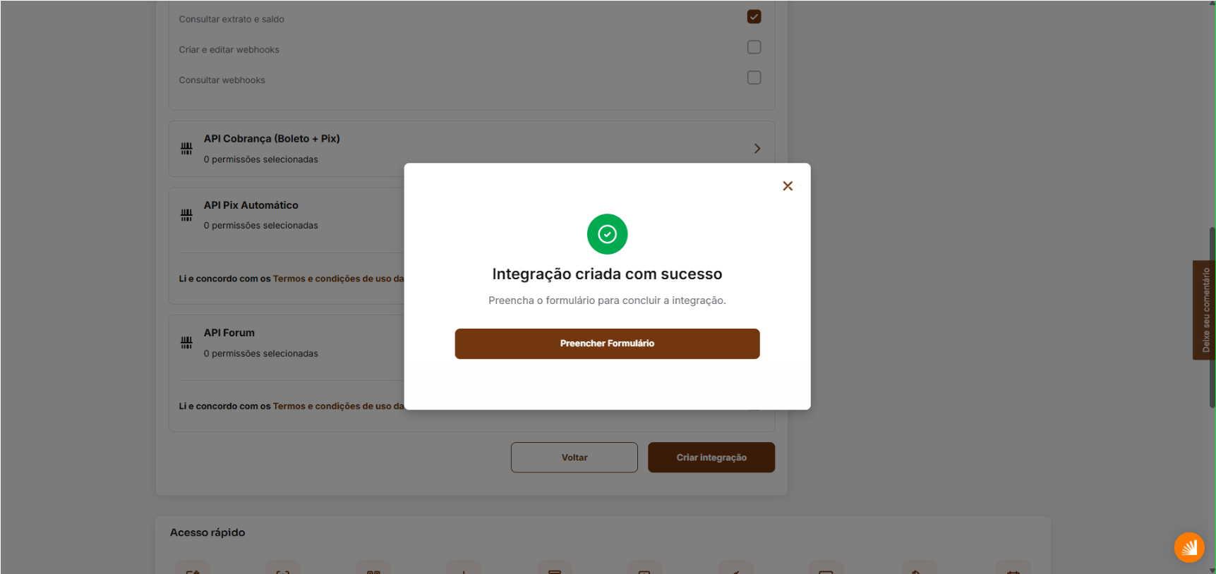 Na página Nova Integração via API, será necessário selecionar as permissões da integração.
